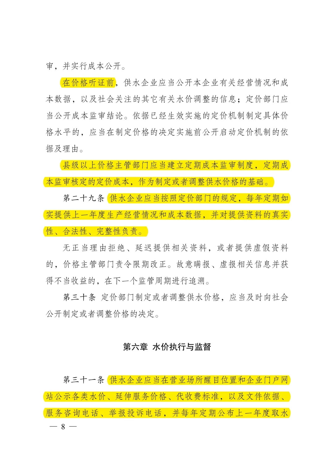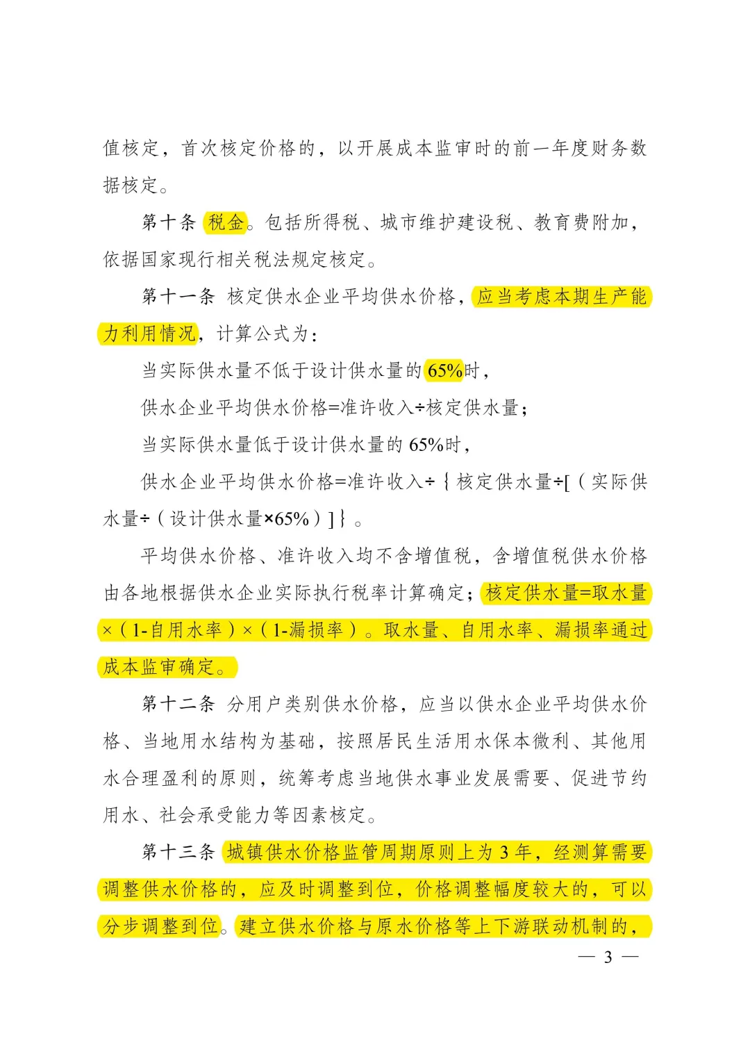 《城鎮(zhèn)供水定價成本監(jiān)審辦法》明確了定價成本構(gòu)成和核定方法。主要內(nèi)容:一是明確城鎮(zhèn)供水定價成本構(gòu)成范圍。按照合法性、相關(guān)性、合理性原則,規(guī)定城鎮(zhèn)供水定價成本包括固定資產(chǎn)折舊費、無形資產(chǎn)攤銷和運行維護費,并對計入定價成本的項目作了具體規(guī)定。二是明確定價成本和有效資產(chǎn)核定方法。細化明確固定資產(chǎn)折舊、原水費、材料費、動力費、人工費等成本費用的審核標準,對可計提收益的有效資產(chǎn)范圍及其核定方法做出明確規(guī)定,對供水企業(yè)職工人數(shù)定員、管網(wǎng)漏損率控制等建立激勵約束機制。