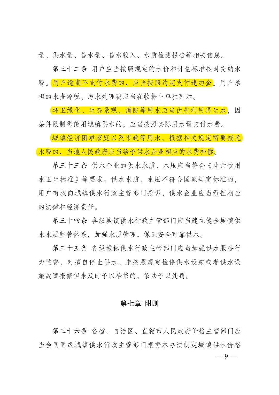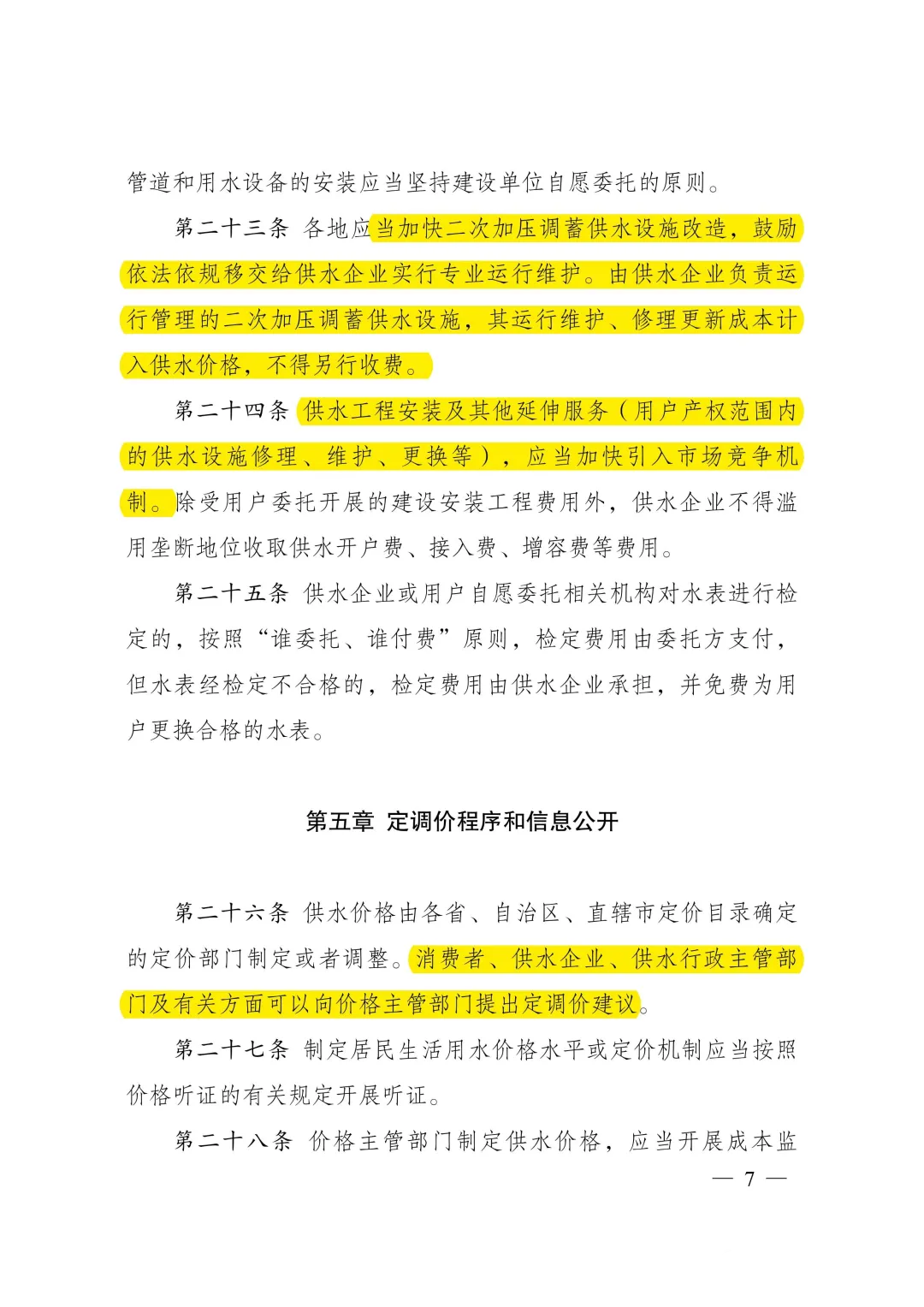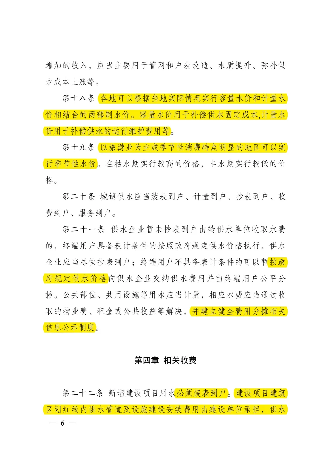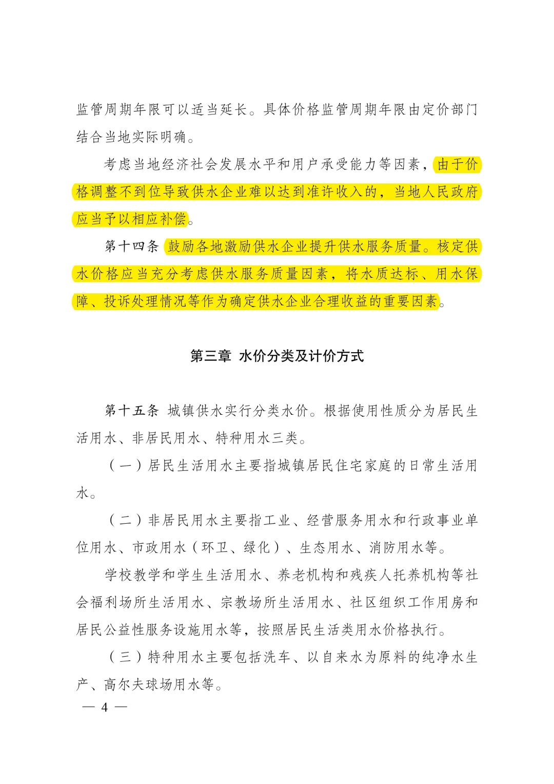 答:《城鎮(zhèn)供水價格管理辦法》明確了城鎮(zhèn)供水價格的定價原則、定價方法、定調(diào)價程序,以及水價分類、計價方式、規(guī)范供水企業(yè)服務(wù)收費行為等。主要內(nèi)容:一是按照“準許成本加合理收益”的方法核定城鎮(zhèn)供水價格。制定城鎮(zhèn)供水價格,以成本監(jiān)審為基礎(chǔ),通過核定準許成本、監(jiān)管準許收益確定準許收入,根據(jù)核定供水量確定供水價格,并統(tǒng)籌考慮當(dāng)?shù)毓┧聵I(yè)發(fā)展需要、促進節(jié)約用水、社會承受能力、服務(wù)質(zhì)量等因素。二是簡化水價分類、明確計價方式。城鎮(zhèn)供水根據(jù)使用性質(zhì)分為居民生活用水、非居民用水、特種用水三類,居民生活用水實行階梯水價制度、非居民用水實行超定額累進加價制度。三是規(guī)范定調(diào)價程序、強化信息公開。要求制定居民生活用水價格水平或定價機制應(yīng)當(dāng)按照價格聽證的有關(guān)規(guī)定開展聽證,并進行信息公開。四是規(guī)范服務(wù)收費行為、提升服務(wù)質(zhì)量。明確供水水質(zhì)、水壓應(yīng)當(dāng)符合國家規(guī)定標準。除受用戶委托開展的建設(shè)安裝工程費用外,供水企業(yè)不得濫用壟斷地位收取供水開戶費、接入費、增容費等費用。