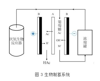 該系統(tǒng)將厭氧生物反應(yīng)器與bmed、濃縮罐進(jìn)行組合,在厭氧生物反應(yīng)器中對微生物進(jìn)行乙醇型發(fā)酵,bmed處理發(fā)酵液中的醋酸鹽以制備醋酸,同時及時對其分離,可以提高系統(tǒng)的產(chǎn)氫能力。