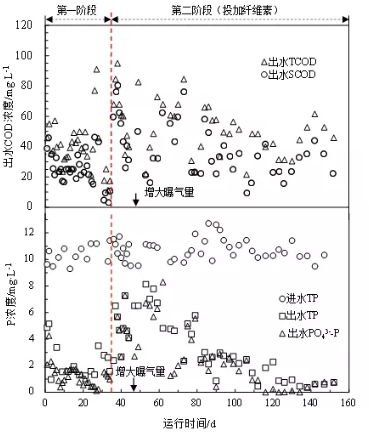 2.1 纖維素對cod與p去除的影響圖2顯示了小試裝置在整個(gè)試驗(yàn)期間出水cod與磷濃度變化。在第一階段進(jìn)水tcod濃度維持在450 mg/l時(shí),出水tcod平均為(39.7±16.1)mg/l,其中scod為(24.8±10.8) mg/l,符合國家一級a排放標(biāo)準(zhǔn)。然而,當(dāng)?shù)诙A段加入纖維素后,cod去除效果明顯惡化,出水tcod最高檢測值高達(dá)95 mg/l(scod為80 mg/l)。為探究加入纖維素后cod去除效果惡化原因,對出水tcod的構(gòu)成進(jìn)行了分析。結(jié)果顯示,加入纖維素后出水ss顯著下降,從(48.25±3.29) mg/l降至(21.34±9.71) mg/l,由此可排除污泥沉降性能惡化導(dǎo)致出水cod升高問題。纖維素富含官能團(tuán)且呈線狀,因此其對污泥具有較好網(wǎng)捕卷掃作用,可促進(jìn)污泥絮體凝結(jié)并提高其緊密度,這一現(xiàn)象通過污泥鏡檢也得到了印證。然而,不論是因纖維素自身作為cod消耗氧氣,還是導(dǎo)致污泥絮體變得緊密都有可能降低氧傳質(zhì),從而弱化了對cod的降解效率。為此,在第46 天對好氧池運(yùn)行進(jìn)行調(diào)整,將曝氣量提高至0.30~0.50 l/min(添加纖維素前為0.10~0.20 l/min)。結(jié)果,出水cod開始逐漸下降并恢復(fù)至投加纖維素前水平(tcod=49.4 mg/l,scod=34.2 mg/l)。可見,回收纖維素對曝氣池運(yùn)行有著積極影響,可提高氧氣傳質(zhì)與利用效率。