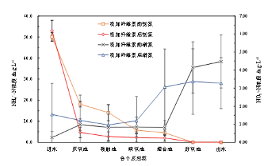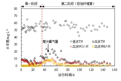 與此同時(shí),纖維素投加對磷去除的影響與cod類似,在纖維素投加初期(第36~50 天),出水總磷(tp)和正磷酸鹽(po3-4-p)濃度均開始惡化,去除率分別降低至51.99%和56.32%。從發(fā)生原因來看,do不足是導(dǎo)致磷去除效率下降的主因,可以從增大曝氣量后出水tp逐漸下降得到驗(yàn)證。然而,出水tp含量在提高曝氣量后的很長一段時(shí)間內(nèi)也沒有恢復(fù)至投加纖維素前水平,而是保持在(2.86±1.22) mg/l左右。為進(jìn)一步分析其原因,在第68 天從曝氣池末端取混合樣進(jìn)行了聚磷菌(paos)活性測定,并與投加纖維素前的活性進(jìn)行了對比。結(jié)果顯示,投加纖維素后,反應(yīng)器中paos比釋磷速率和比吸磷速率分別為11.3 和12.0mg/(gvss?h),與投加前的10.8 、13.4 mg/(gvss?h)相比變化并不是很大。可見,纖維素的投加對paos活性的影響并不大。因此,反應(yīng)器除磷效果恢復(fù)較慢的原因可能與纖維素投加初期導(dǎo)致的跑泥和生物量恢復(fù)較慢有關(guān)。2.2 纖維素對氮去除的影響圖3顯示了在投加纖維素前后裝置對氮去除效果的變化。從整體上看,反應(yīng)器無論是否投加纖維素均能夠很好地完成脫氮,投加前出水tn、nh4+-n和 no3--n平均濃度分別(5.9±3.1)、(0.40±0.96)(4.59±2.22)mg/l,投加后為(7.80±5.46)、(1.30±2.00)、(4.11±2.22) mg/l。只是在纖維素投加初期,出水tn出現(xiàn)明顯惡化,此時(shí)出水中nh4+-n明顯增多,這顯然與上述氧傳質(zhì)受限有關(guān)。圖3顯示,在增大曝氣量后對tn的去除效率迅速恢復(fù),主要是因?yàn)橄趸芰﹂_始恢復(fù)。