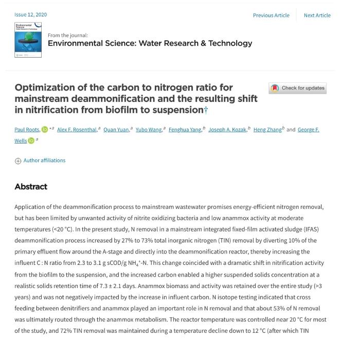 目前他們已經(jīng)有一些發(fā)表的論文成果,例如下邊這篇文章,他們發(fā)現(xiàn)改良碳氮比的過(guò)程還伴隨硝化反應(yīng)從生物膜轉(zhuǎn)移到懸浮液相中。這一個(gè)個(gè)的小發(fā)現(xiàn)都會(huì)幫助研究人員加深對(duì)pdn/a工藝關(guān)鍵控制和潛在機(jī)制的理解。