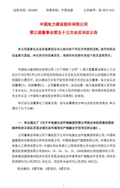 近日,中國(guó)電建發(fā)布公告稱(chēng),公司審議通過(guò)了《關(guān)于中電建生態(tài)環(huán)境集團(tuán)有限公司聯(lián)合體投資建設(shè)國(guó)家海洋經(jīng)濟(jì)示范區(qū)靈昆全域生態(tài)環(huán)境導(dǎo)向產(chǎn)城融合開(kāi)發(fā)項(xiàng)目的議案》。
